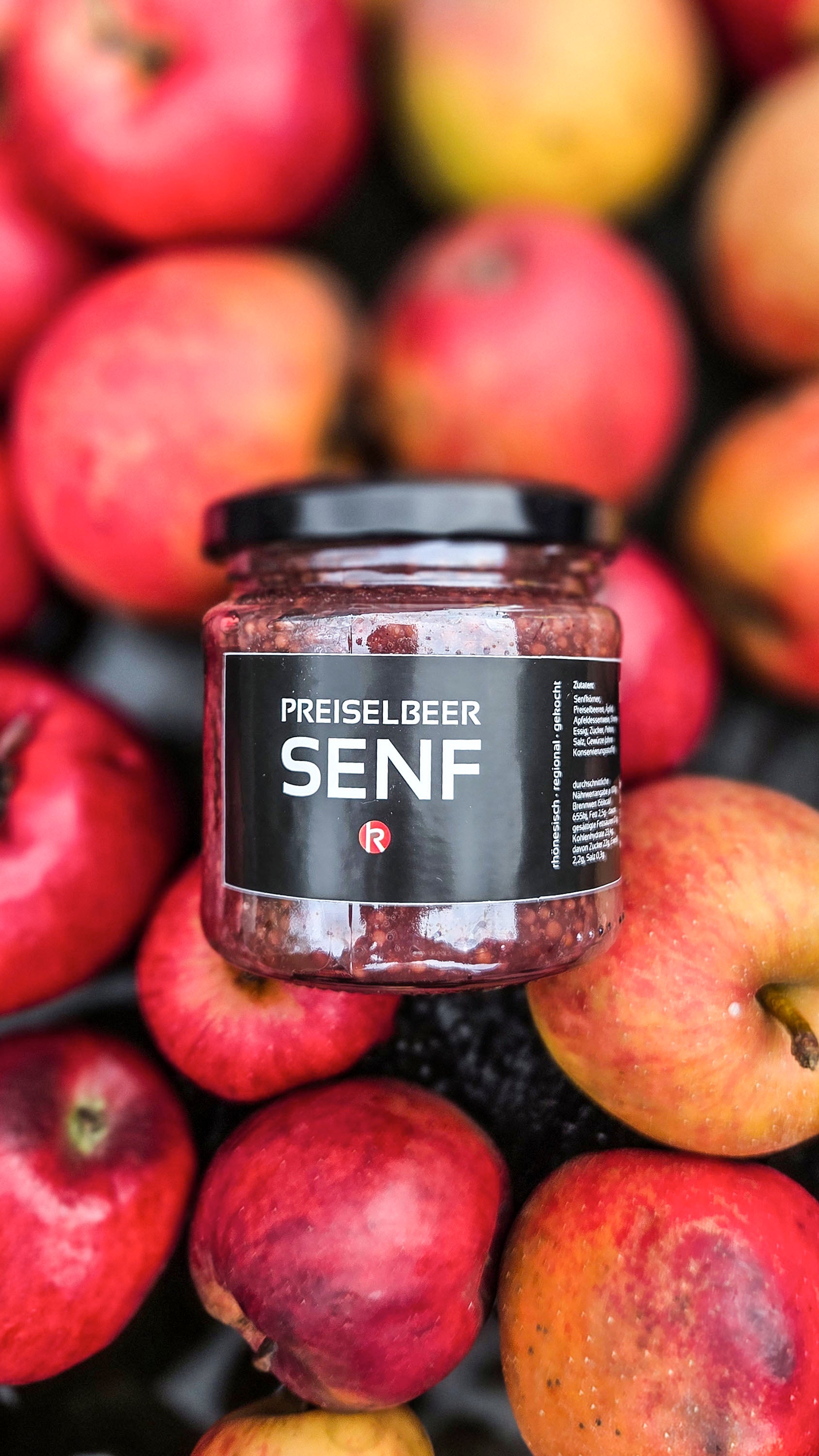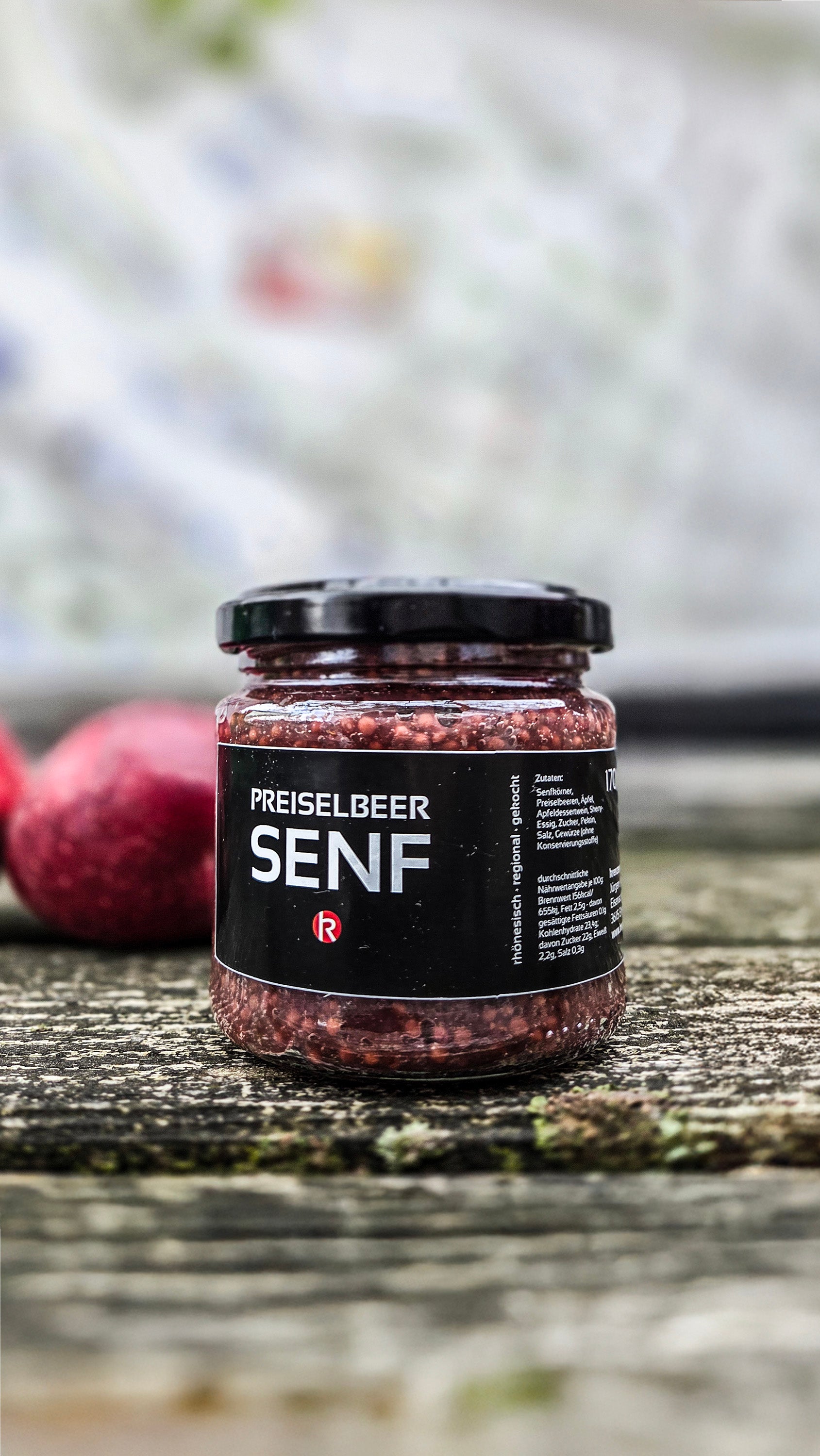 Zutaten: Senfkörner, Äpfel, Sherry-Essig, Apfeldessertwein, Zucker, Preiselbeeren, Zimt, Muskat, Pektin (Inhalt: 170ml)